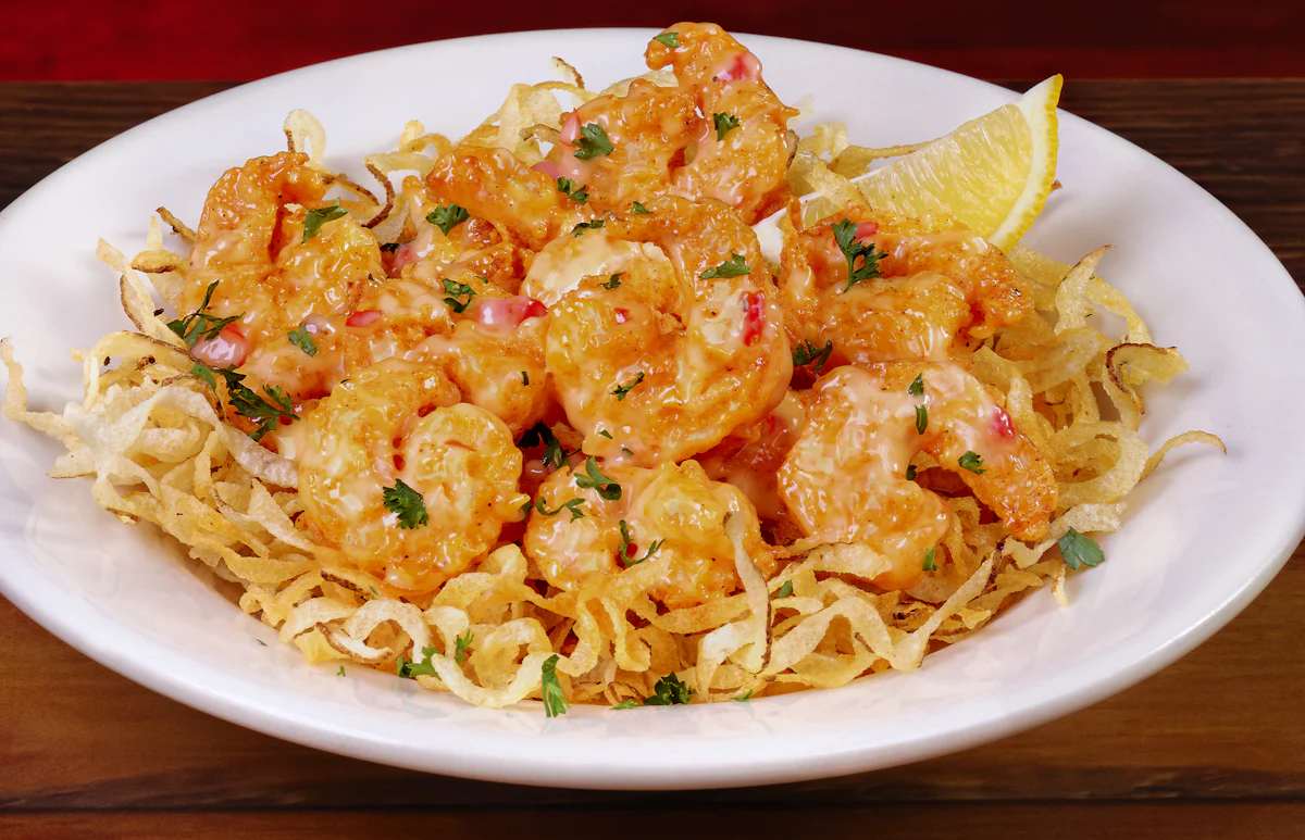 Hand-breaded shrimp lightly fried and tossed in a spicy cream sauce then topped with green onions and served on a bed of potato straws